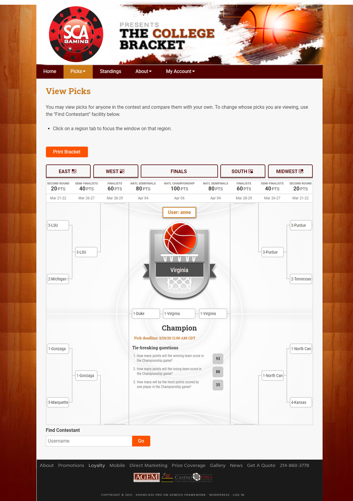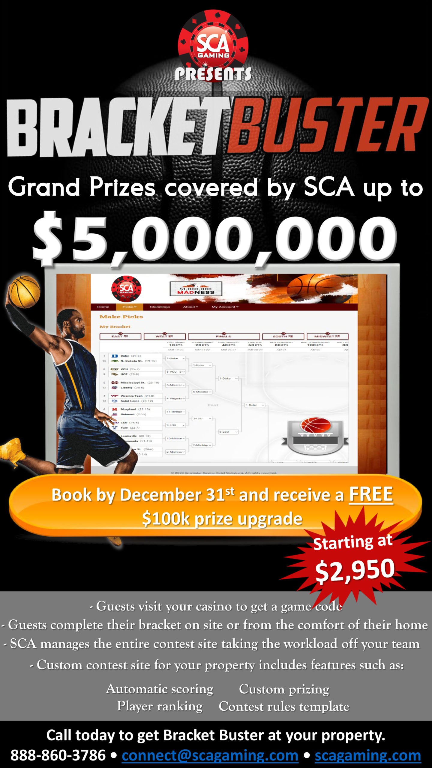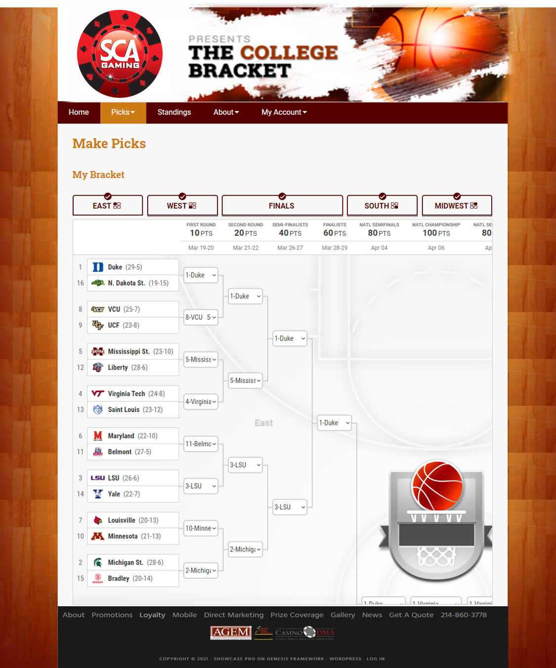 Drive loyalty and engagement with our online bracket prediction contest. As 64 teams go head-to-head in a single elimination tournament, SCA’s online bracket for the college basketball championship is quick and easy to setup. Participants register and complete their brackets online. Gold, Silver & Bronze cash prize options available to fit your budget.