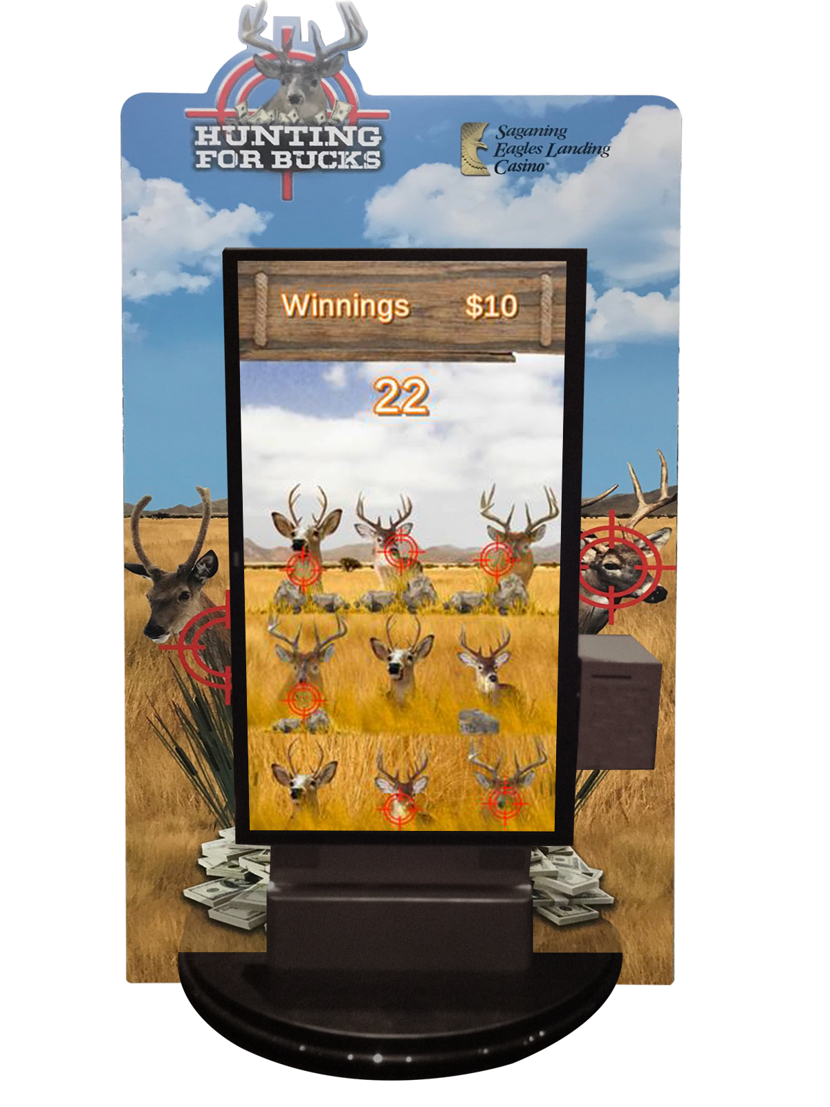 Guests can take aim and test their skill with Hunting for Bucks. Our digital game places deer in the crosshairs as guests attempt to hit as many as possible. Deer pop up in the field and the more guests hit, the more they win.