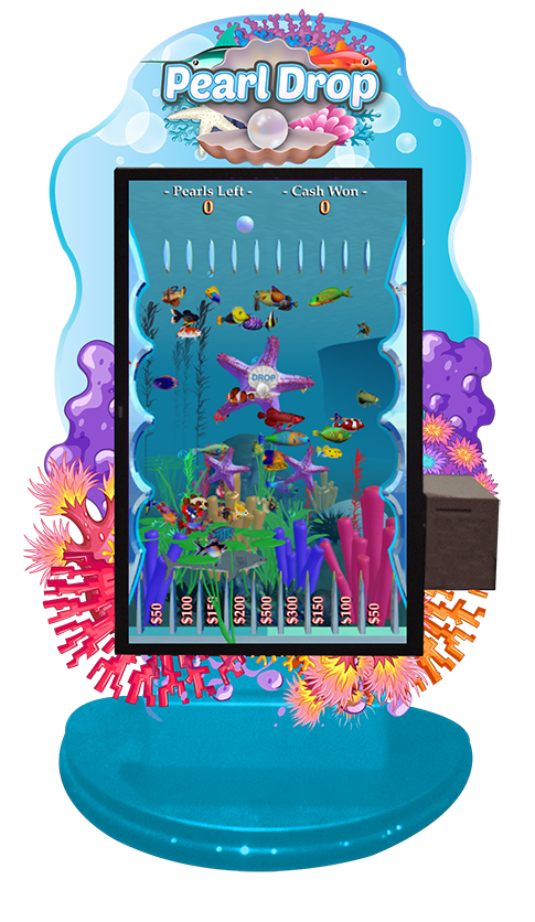 Drop a tropical adventure right onto your floor. Your players will love the vibrant colors and sounds of our new Pearl Drop digital kiosk game. Reward players with customizable prizes. SCA’s coverage gives you the option to add a mega-prize and still stay within your budget. While the pearl is sinking through the sea of fish, if it happens to hit a designated multiplier fish, the player is awarded that prize multiplier to whatever receptacle the pearl lands in.