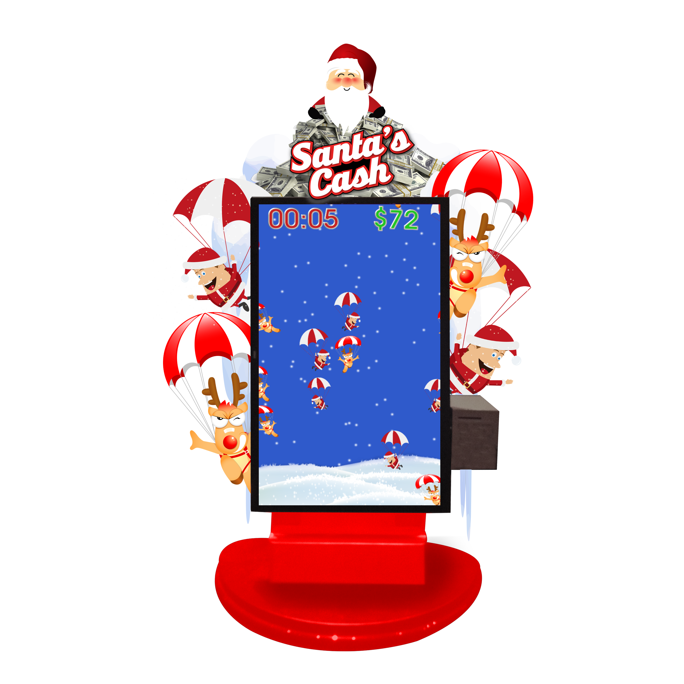 Players tap Santa’s and reindeer on the game screen to reveal cash prizes.
